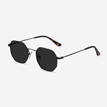 Óculos de sol com design geométrico moderno e armação preta. Lentes escuras para proteção e um visual arrojado.