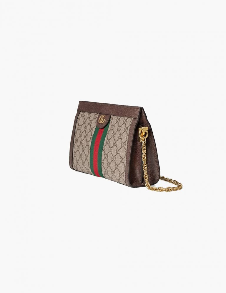 Bolsa de ombro pequena Gucci Ophidia GG com padrão icônico, faixa Web e corrente dourada. Elegância vintage e contemporânea.