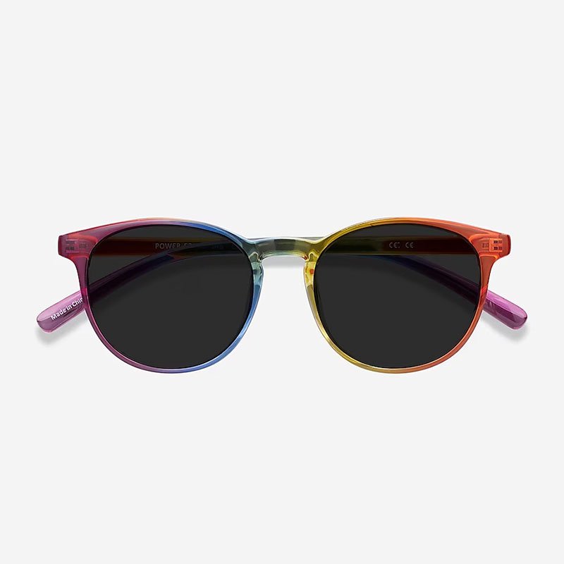 Óculos de sol com armação multicolorida, lentes escuras e design retrô moderno. Um acessório vibrante, estiloso e cheio de atitude.